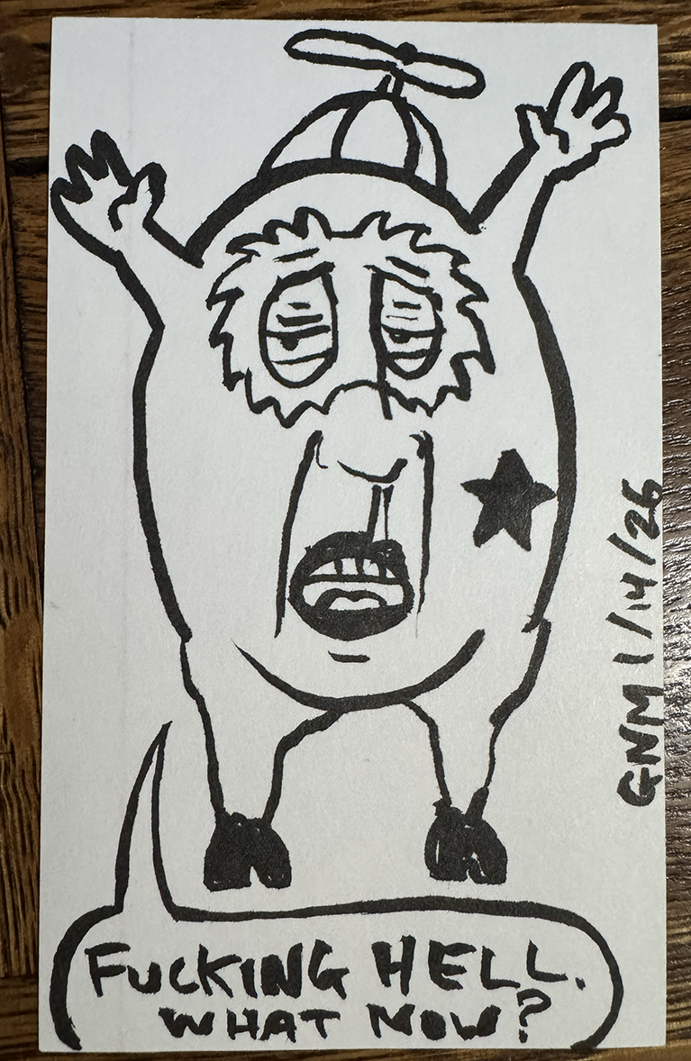 Sometimes I’ll take a phrase and use it to jump start the sketching process. When I hit on one I like (i.e. “I Am A Star Wars” or “I Prefer Dirtbag Paradise”) I’ll do it until I get tired of it. This “Fucking Hell” one had a pretty good run, but I’m past it now.