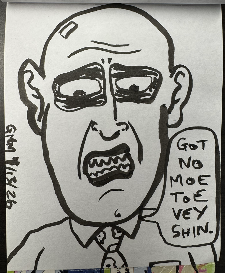 Came up with this guy in high school. Seems like a mashup of Tor Johnson and Uncle Fester. Don’t remember his name.