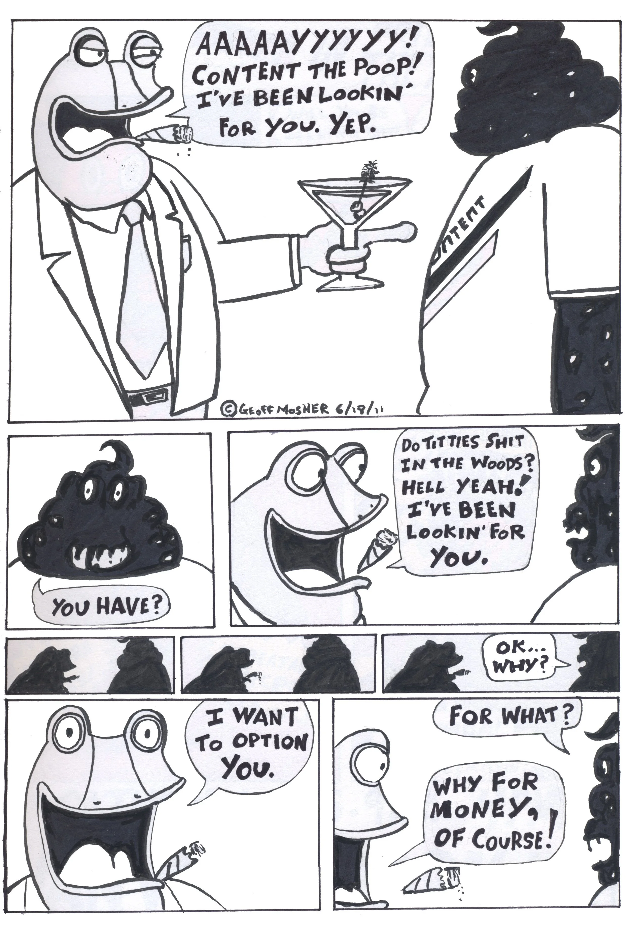 This comic features Garbage Frog (an alcoholic Hollywood Studio head) and Content the Poop. Will they ever appear in “Yucks”? Who can say, but they sure appeared in Mondo Chachi plenty. I also just realized looking at the old tags, that this strip was originally called Mondo Happytown, I had completely forgotten about that. And now, on with the show: